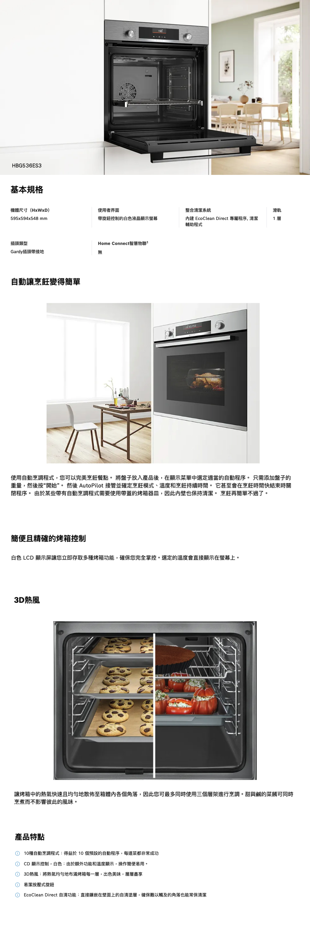 烹調模式:全面燒烤, 節能式熱風, 3D熱風, 上下加熱, 披薩設定, 底部加熱, 熱風上火燒烤