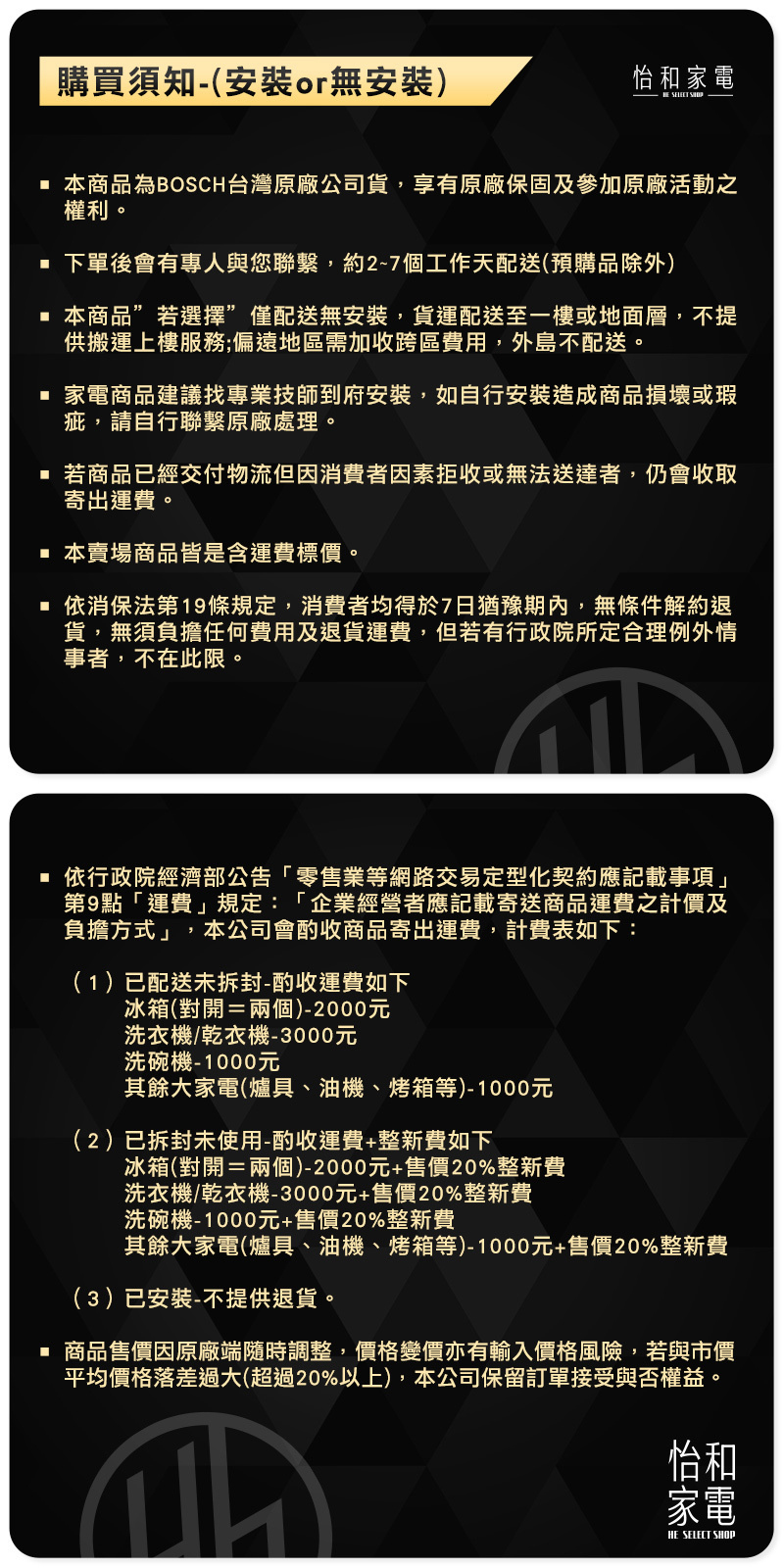 ※大型家電(洗衣機/冰箱/電視/空調/酒櫃/洗碗機)經到府安裝後之商品,會酌收商品之售價*40%整新費*