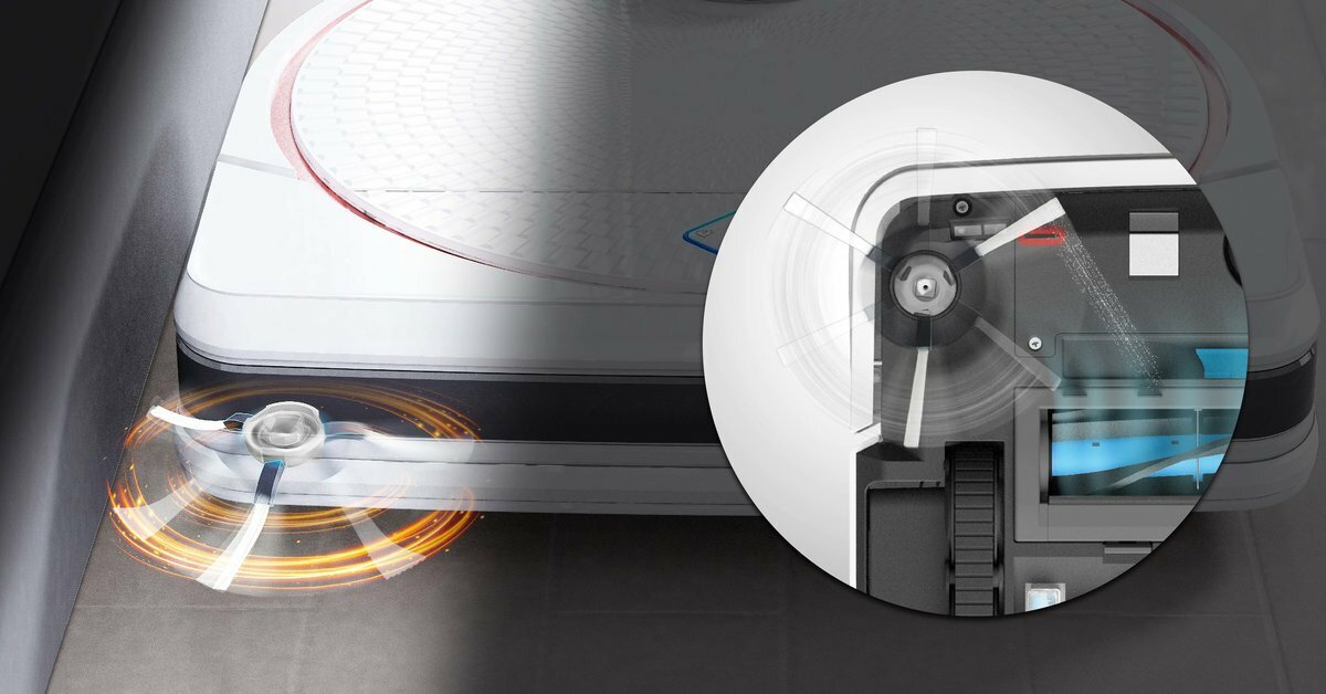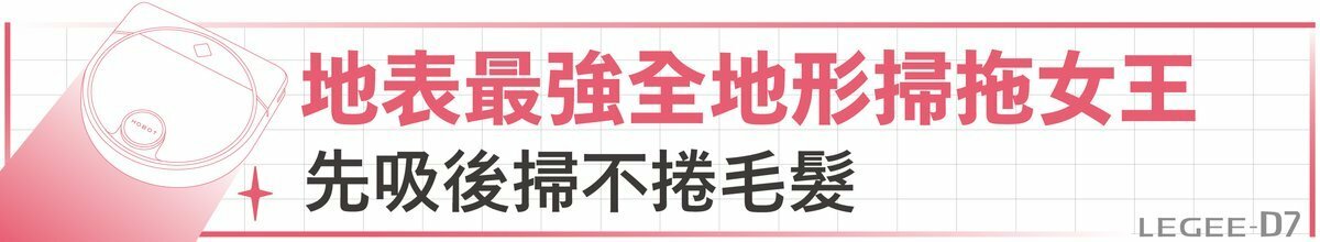 LEGEE-D7 再造掃拖新淨界,聰明安排『吸』『掃』『噴』『拖』極效能清潔流程,前吸髮口 × 滾刷率先聯合出馬,外掛迴旋邊刷傾角拍塵,一擊除盡地面落髮粉塵。