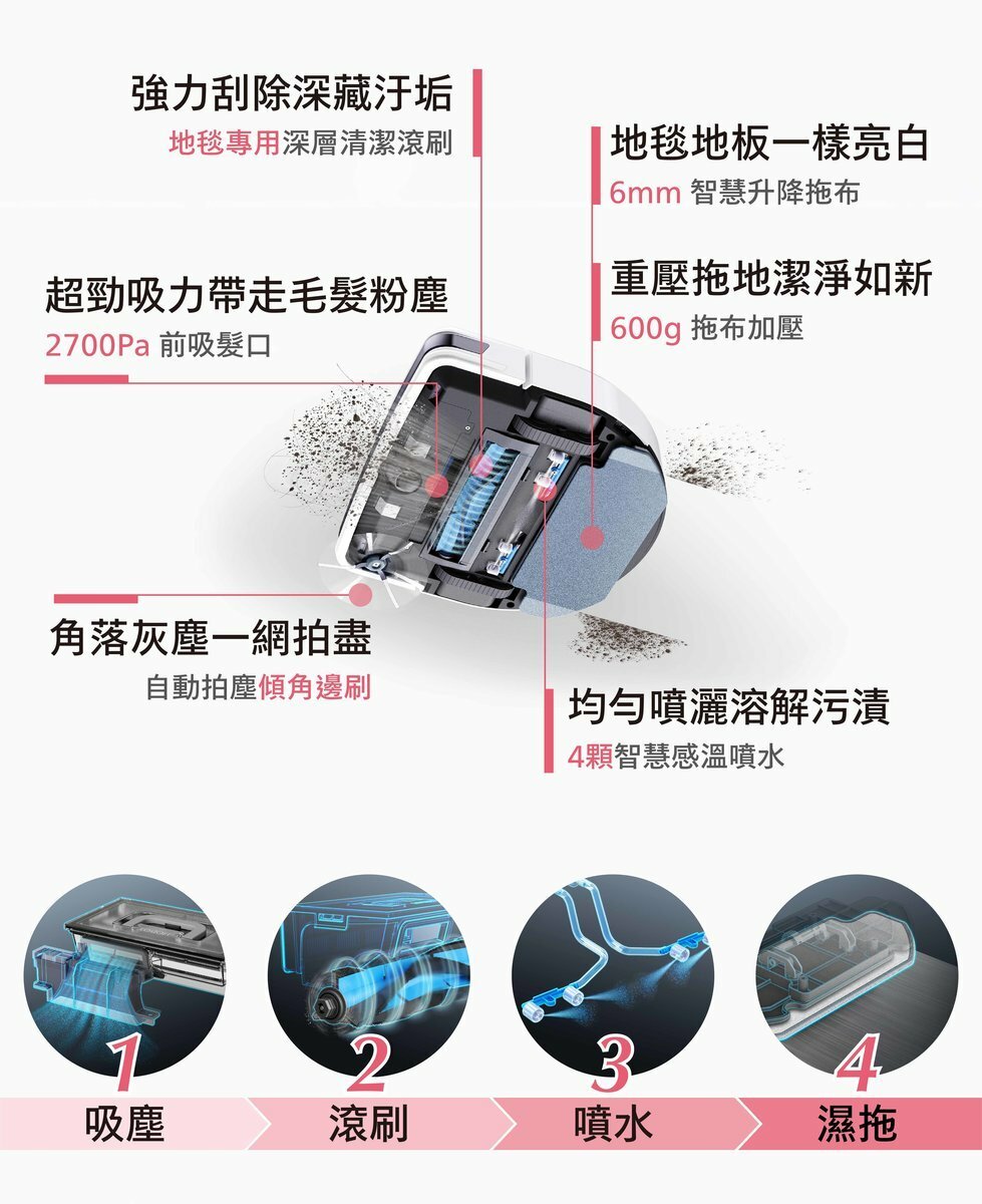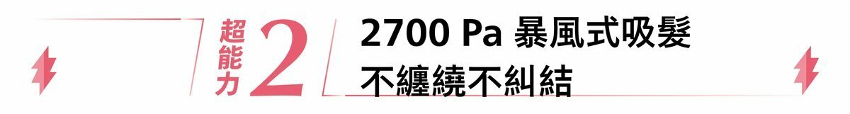 ◆2700 PA 超強勁雙吸塵通道,先吸後掃不捲毛髮