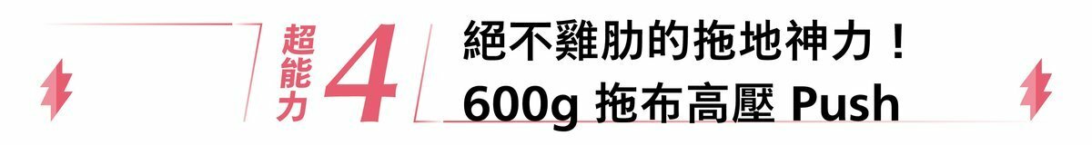 600g 重壓拖地接力上陣,搭配真智慧感溫給水系統,均勻噴水於地板,持續施壓重拖,不管落塵還是污漬全都吃乾抹淨,不用花一分力氣,只需原地驚呼地板原來這麼亮白!