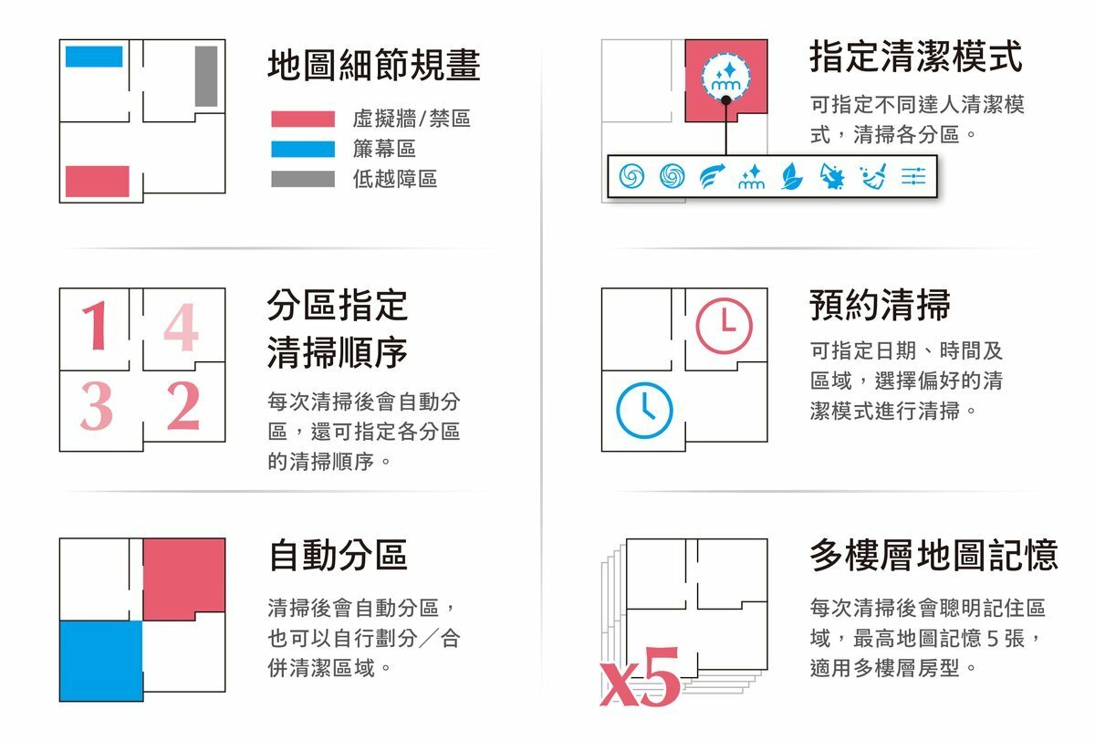 隨時隨地回應清掃需求,舉凡動態即時地圖、預約清掃、地圖記憶、分區清掃、虛擬牆功能,當然通通辦得到,多樓層地圖更多達 5 層。三兩下彈指功夫,時刻維持地板光潔如新,外務你忙,內務清掃交給使命必達,拯救無數婚姻的雷姬管家。