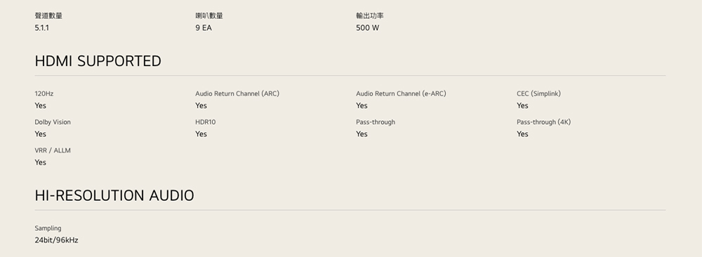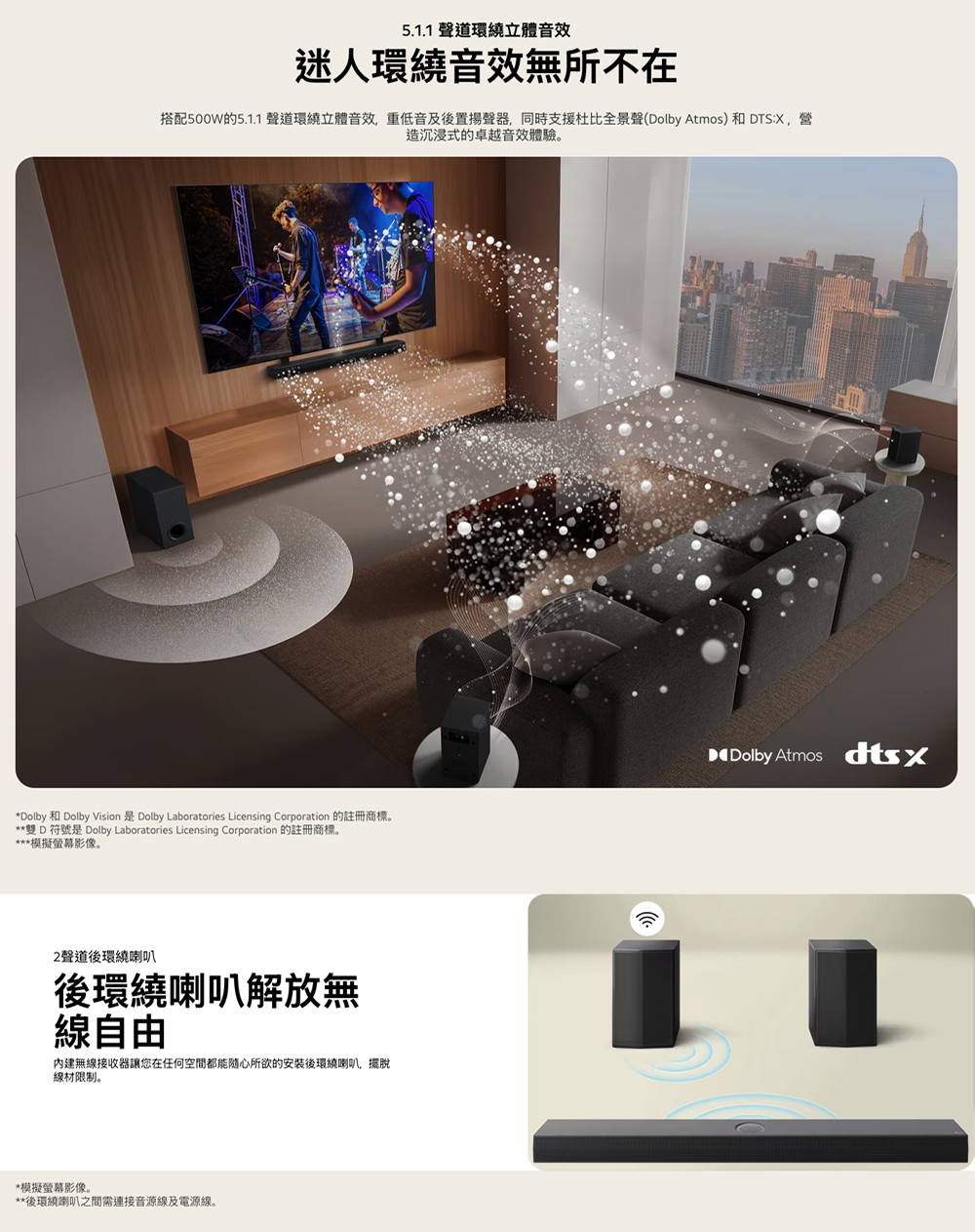 搭配500W的5.1.1 聲道環繞立體音效,重低音及後置揚聲器