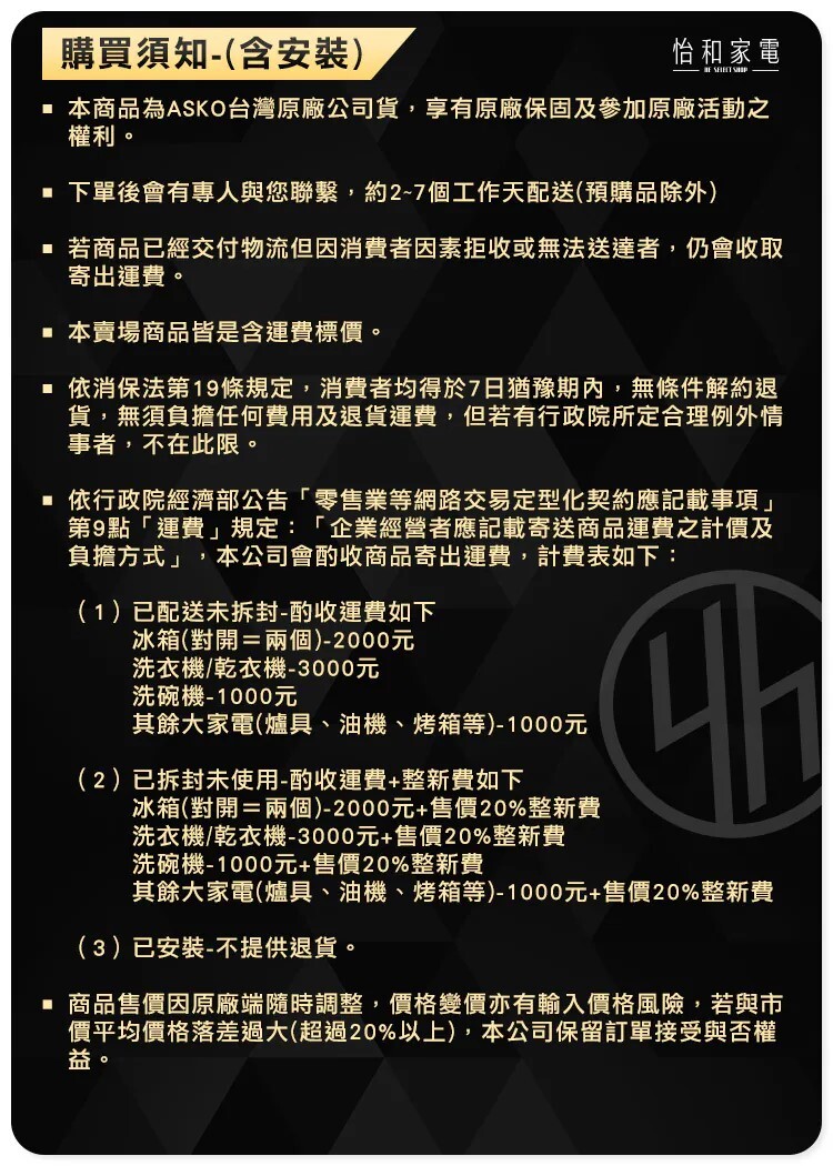 ※大型家電(洗衣機/冰箱/電視/空調/酒櫃/洗碗機)經到府安裝後之商品,會酌收商品之售價*40%整新費*
