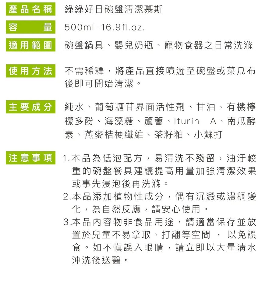 產品名稱:綠綠好日碗盤淸潔慕斯
