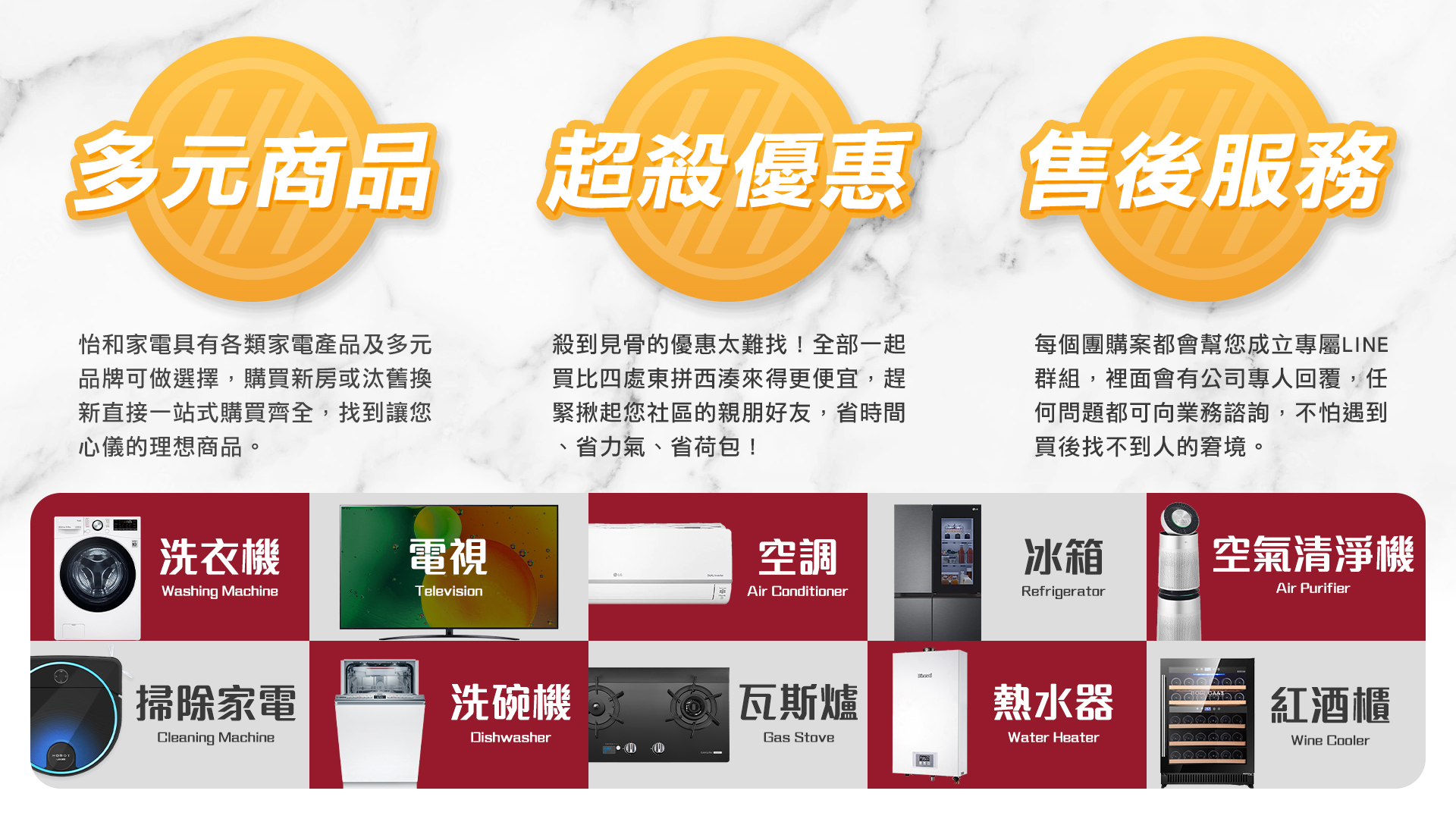 買家電要到處比價?跑來跑去還不見得找得到合適的?太麻煩了吧!現在怡和家電提供您超優家電【團購方案】直接一次買齊又殺到最低!厝邊鄰居揪一揪,全部一起買最划算~