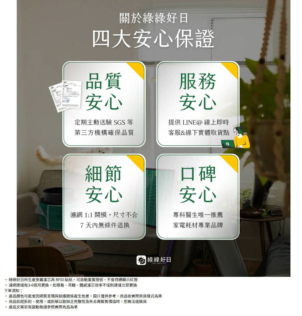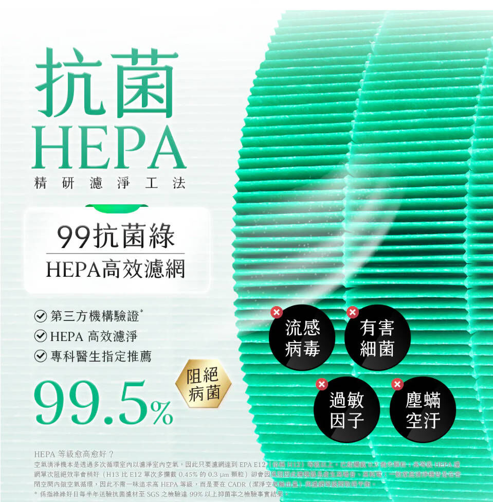 🟢 強效抗菌 HEPA 濾芯:高效『99抗菌綠』實證有效抗菌抗病毒,適合所有安心居家環境