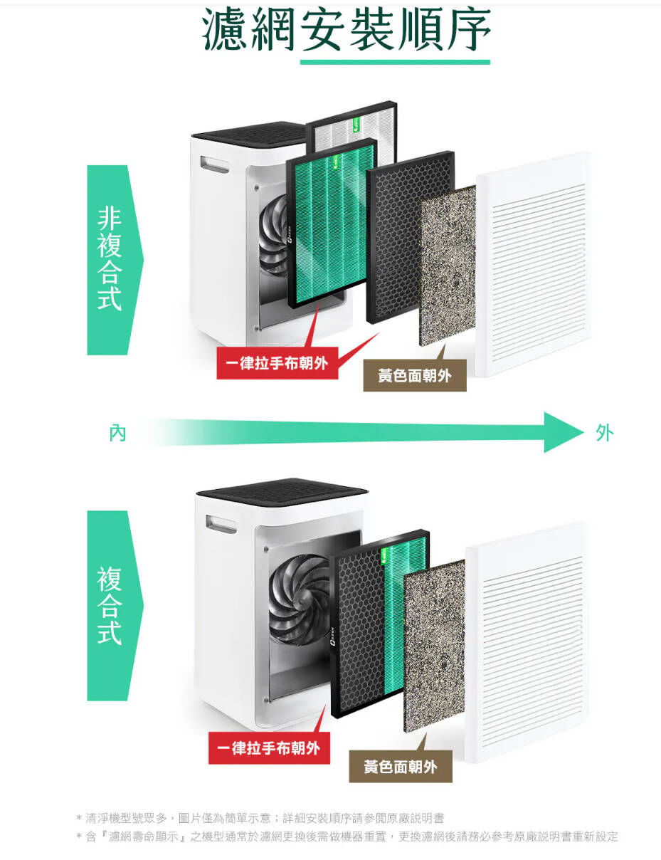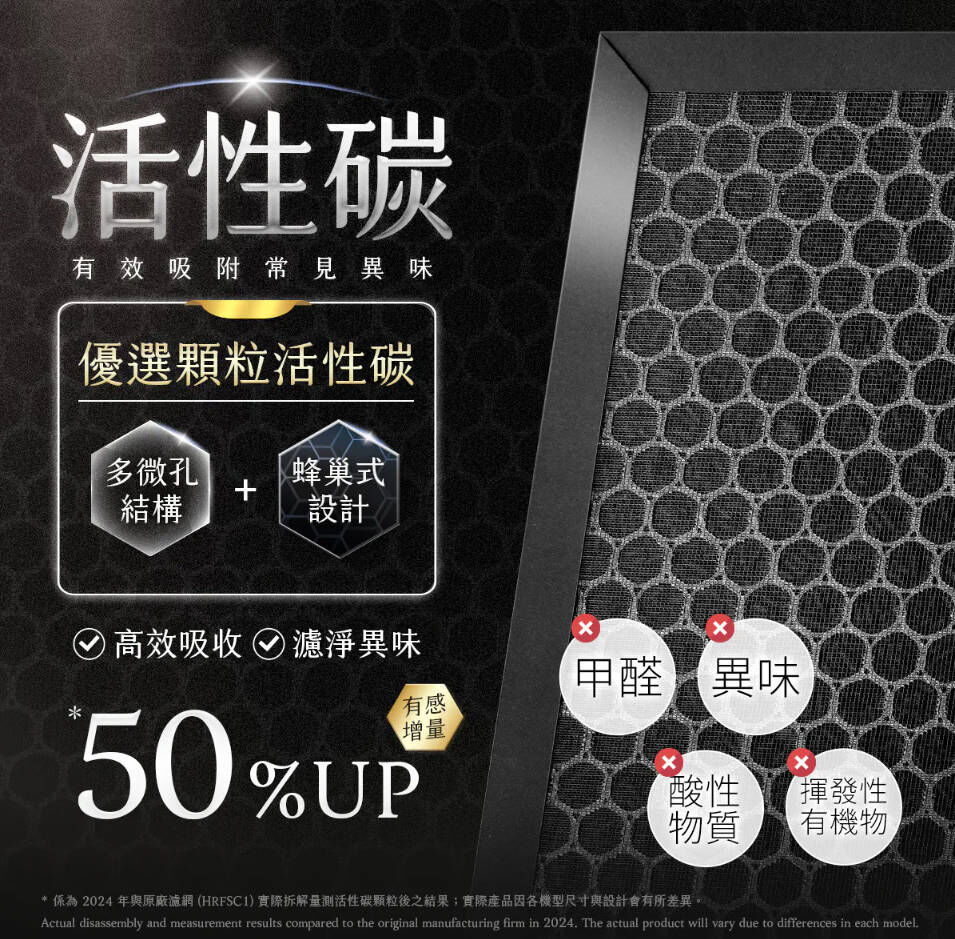 ⚫️ 蜂巢式顆粒活性碳濾網:大量顆粒活性碳能加倍吸附異味、甲醛功效,效期更長;搭配仿生蜂巢狀結構,更能降低風阻,多方位透氣並吸附家中常見異味